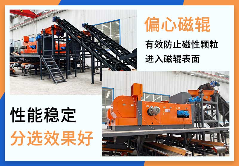偏心渦電流分選機采用一體化的設(shè)計理念,將振動給料機、磁輥、磁滾筒、輸送皮帶機、渦電流分選主機集成于一體,可以減少設(shè)備總體積。設(shè)備前端,通過磁選原理,去除物料中夾雜的鐵質(zhì);設(shè)備后端,通過渦電流原理,將物料中的銅鋁等有色金屬雜質(zhì)通過作用力彈射出來,最終達到分離鐵質(zhì),有色金屬,和其它物料的效果。